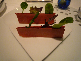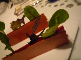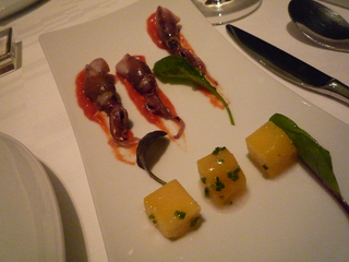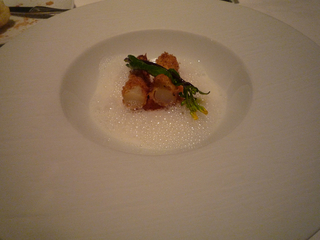 今日のディナーはコチラへ初訪〜以前に予約していたのですが大事件勃発にて延期・・・やっと訪問出来ました!【外観】こ〜んな感じ・・・近代的な外観ですなぁ〜(表現が古っ・・・笑)【メニュー】さぁ〜て何を喰らうかなぁ〜同じ食材を「温・冷」の2種の調理法で提供されるムニュー・ドゥ・コンパレゾンというコースをセレクト!メチャクチャ楽しみにしていたのでおっさんもアゲアゲです・・・爆【アミューズ3種】皿にボコボコと穴が開いておりまして・・・そこに三種を自分の好きなように挿していくコンセプト〜【ア・ボルテ・サンテ】まずは泡にてア・ボルテ・サンテ〜やっぱり若干重めなフィリップ・ラマリエール「グランド・レゼルヴ」の方がお互い好みでしたなぁ〜アミューズをアテにグビグビと・・・【駿河湾産 桜海老のクルスティヤンとキャビアのサンド】じゃ〜ん!おっ・・・プランターのようだなぁ〜と貧困な表現しか出来ないオイラ達・・・笑桜海老を練りこんだ薄い焼物の間にサワークリーム&キャビアを挟み込みフレッシュハーブが可愛く刺さっております!食べると・・・おっまさに海老煎〜これはアテに最適な一品です!【パン】無塩&有塩のバターが提供〜相方が3種のパンのうちドチラをお召し上がりですか?と問われ全部〜なんていうからオイラの皿にも3個のパンが・・・笑温かいのをちょいちょい貰えば良いのに〜全く食いしん坊な相方です・・・爆【白ワイン】コヤツにチェンジ〜【ホタルイカ】おっ・・・食べられる天然記念物の提供です!コヤツを温・冷で楽しむわけです・・・さぁ〜どんな料理なんざんしょ!【産地直送こだわりの春の野菜ホタルイカのソース】じゃ〜ん!コッチが温だよなぁ〜(困った人・・・笑)センターのソースがホタルイカです・・・このソースが濃厚で旨い!酒呑みにはたまらないソースです!パンに付けて喰らいましたよ〜(ちょいとパンとの相性は生臭く???でしたが)相方はスプーンで掬ってアテにしておりました・・・笑【ホタルイカとインカのめざめサラダ仕立て】じゃ〜ん!コヤツが冷〜ホタルイカをトマトソースで・・・まぁ〜見たまんまなお味ですが・・・【ワインチェンジ】コヤツにチェンジ・・・【アスパラガス】またまた春を楽しむ旬な食材が・・・コヤツを温・冷で楽しみます!【海老のコンソメジュレと白アスパラガスのヴルーテ】じゃ〜ん!コヤツが冷〜【フランス産白アスパラガスのフリットパルメザン香る卵黄と共に】じゃ〜ん!コヤツが温〜コリッコリな歯応えの白アスパラ美味しいですなぁ〜黄身が隠れるほどの泡にて残念ながらパルメザンな感じはしませんでした・・・しっかり掻き混ぜれば良かったかなぁ〜しかしコチラ泡々での提供が好きなようですなぁ〜(笑)【アスパラスープを喰らう】メッチャ濃厚なアスパラのスープですよ〜海老コンソメのジュレが口に入ってとける〜味の変化も面白いですなぁ〜【泡&山口県荻産桜鯛のマリネと生ハムのコンソメ】じゃ〜ん!泡と一緒にコヤツが提供されましたよ〜【山口県荻産桜鯛のマリネと生ハムのコンソメ ズームアップ】こ〜んな感じ・・・産卵期を控えた真鯛は綺麗な桜色になるだけでなく脂ののりも最高でまさに今が旬です!しかも皿の淵に鱗の素揚げを並べるなんざ粋な計らいですなぁ〜真鯛の鱗は香ばしくて美味しいのですよ〜【桜鯛をコンソメに浸して喰らう】う〜ん・・・上品で美味しいのですが・・・醤油が欲しかったのが正直なところ・・・ザ・大和魂な男なんで・・・笑【本日の鮮魚 新ワカメのブールブランソース】じゃ〜ん!魚料理はコチラ!【本日の鮮魚 新ワカメのブールブランソース ズームアップ】実は・・・魚種は忘れちゃいました・・・笑見た目から判断すると鯛かなぁ〜カリっとした皮目とレア気味な身・・・絶妙な火入れブールブランソースなのでバター&酸味のガツンとくる味付けです!【赤ワイン】お次はコヤツで・・・【鴨の温〜】じゃ〜ん!肉料理は鴨or仔羊からオイラは鴨をチョイス!鴨好きなんでねぇ〜マダムビュルゴーのシャラン鴨胸肉のロティ 白と赤のソースです!【マダムビュルゴーのシャラン鴨胸肉のロティ 白と赤のソース ズームアップ】こ〜んな感じ・・・いや〜この鴨も火入れも絶妙〜皮目のパリパリ感&真っ赤なボディ・・・最高です!しかもこの鴨の素材自体が素晴らしい・・・熟成具合が良いのか今まで食べた鴨の中でNo1かと思われます!【冷の鴨〜】鴨もも肉 本日のアンプロヴィザシオンサラダの中に鴨ちゃんが・・・う〜コヤツは特に・・・サラダ仕立てで提供するなら無理に温・冷に拘らなくても・・・と思ってしまった【温の仔羊〜】仔羊は相方のチョイス〜北海道産仔羊のロティ山椒の香るソースです〜もう少し身が付いているとありがたいですよねぇ〜なんか見た目は食後の残骸(骨)のように見えますなぁ・・・笑相方はナイフで捌くの大変そうでした・・・笑あまりクセのない仔羊ちゃんで相方も拍子抜けじゃなかった