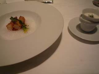 【海老のコンソメジュレと白アスパラガスのヴルーテ】