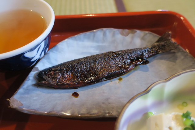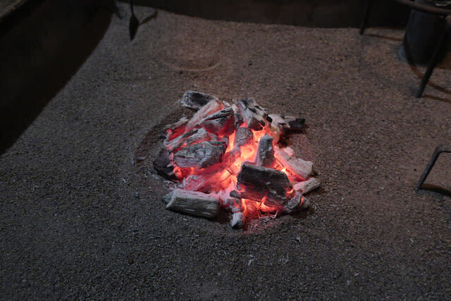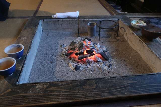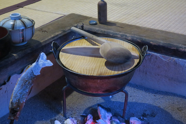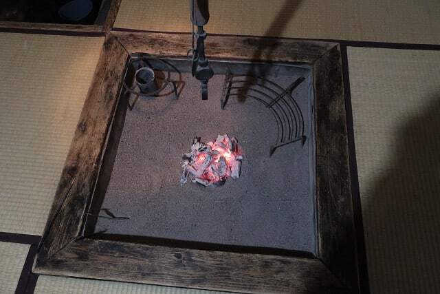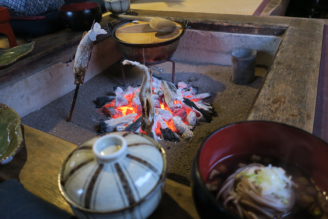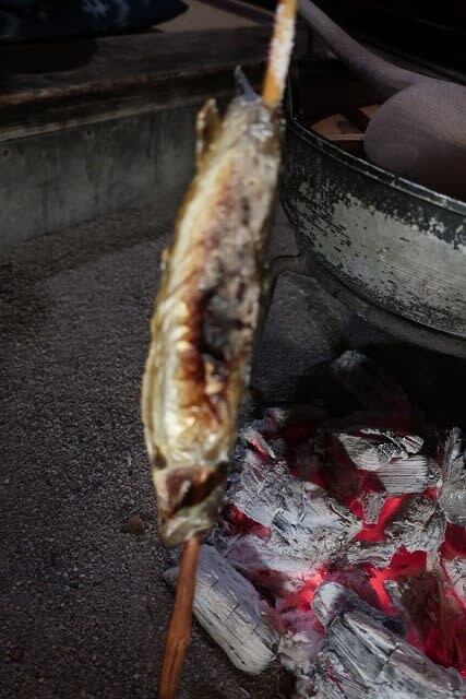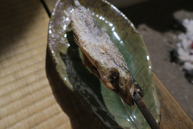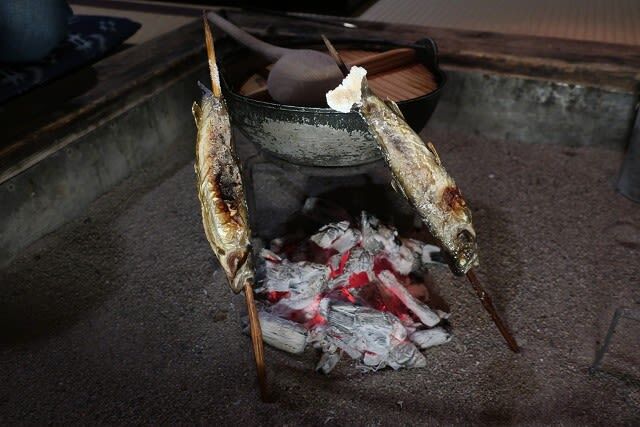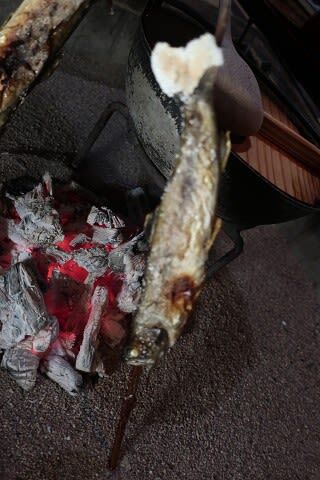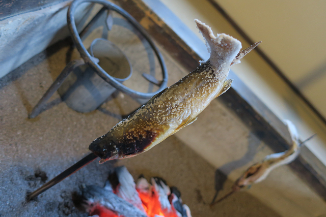 囲炉裏で焼き上げられるイワナ