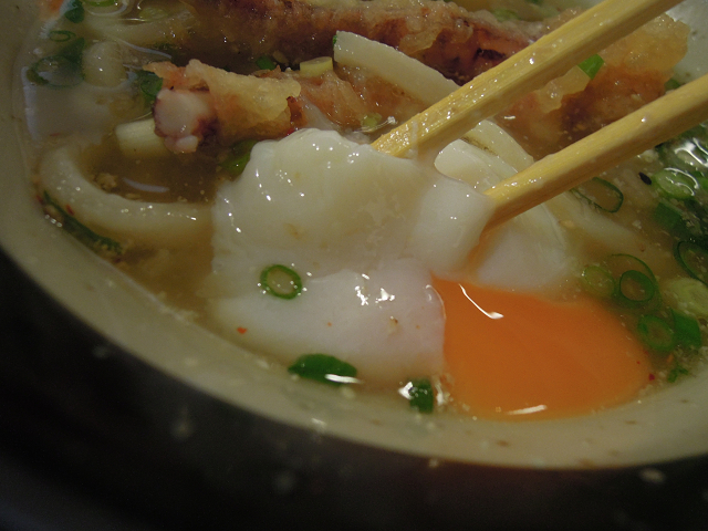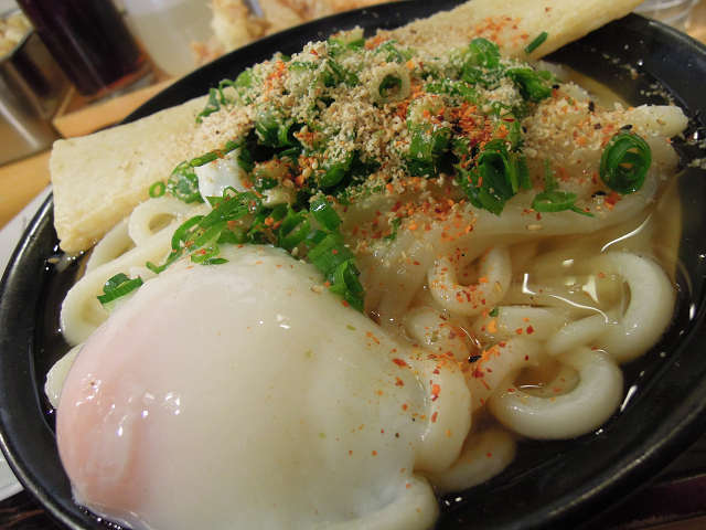 【かけ(冷)大盛<大>上天・下足天・温泉卵ズームアップ】
