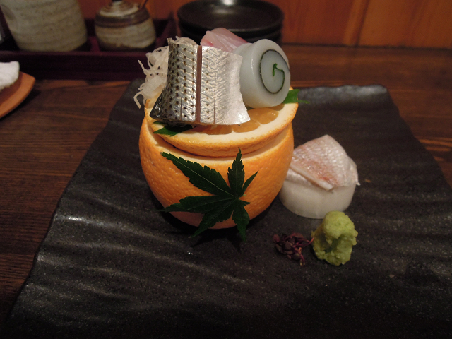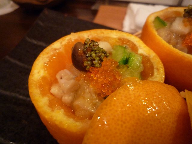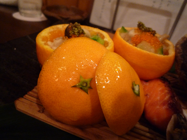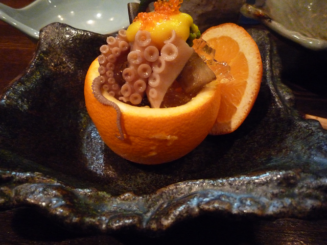 【柑橘系の器に入った蛸等】