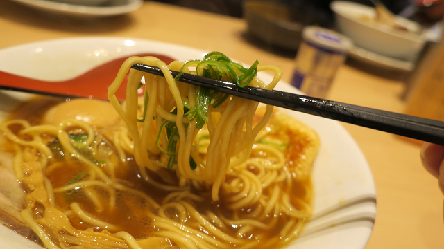 細ストレート麺が醤油の強めな鶏&魚介系スープを口の中に運び込むと奥行深い味わい広がり幸せな気持ちになりますなぁ~