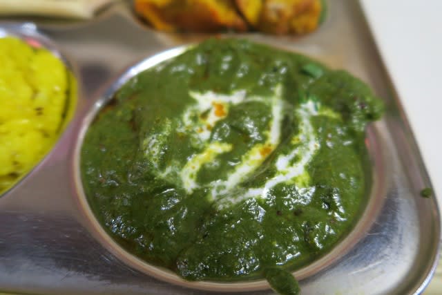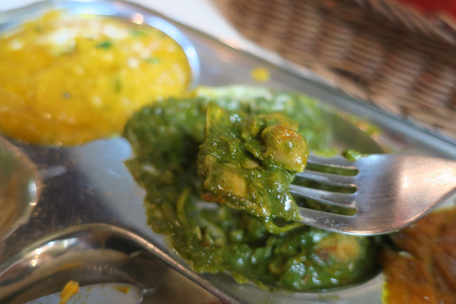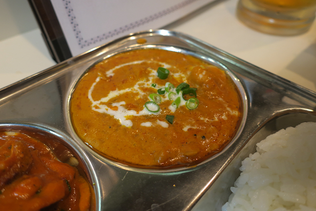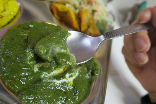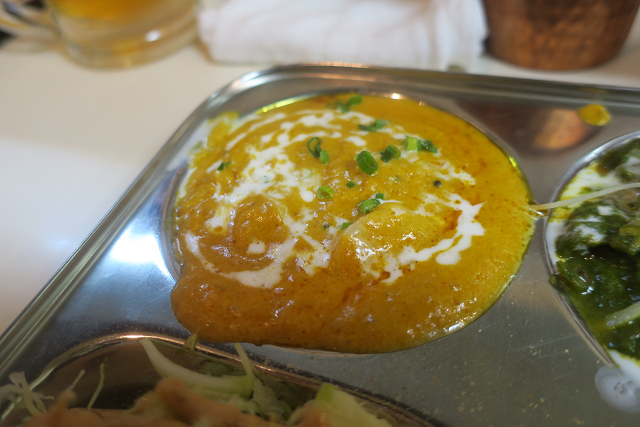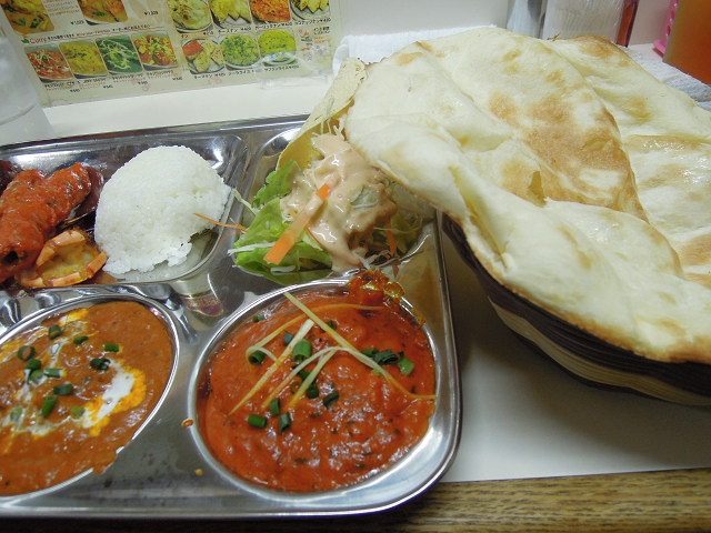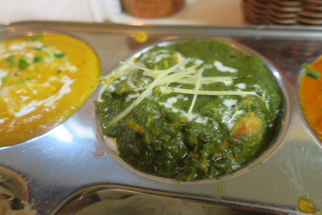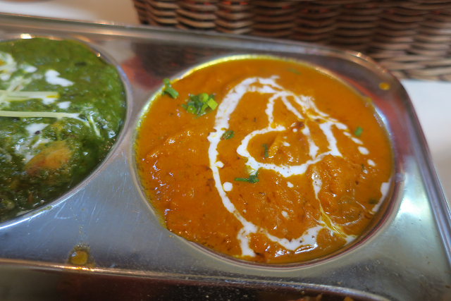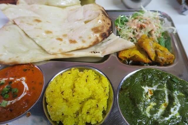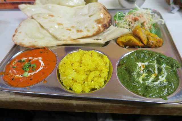 マッシュルームとほうれん草のカレー・バターチキンカレー・サフランライス・チキンティッカ・サラダ・ナンのセットです!