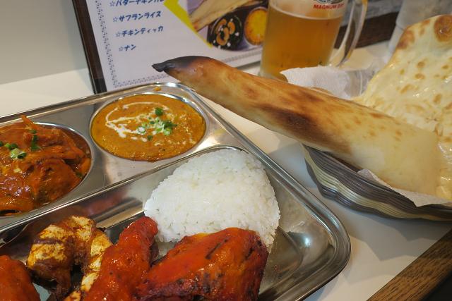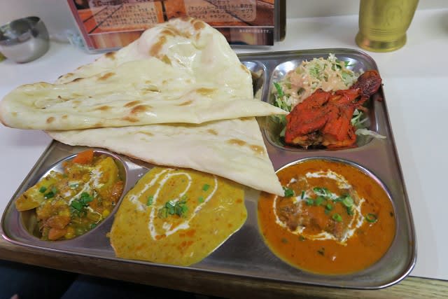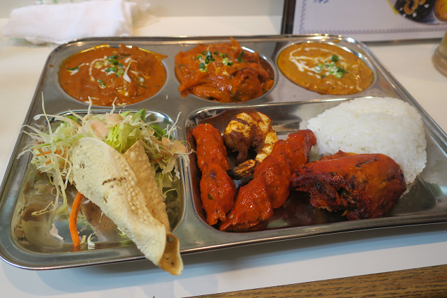 カレー3種・タンドリーチキン・サラダ・ナンのセットです!