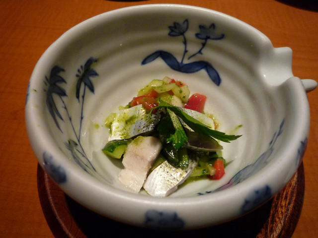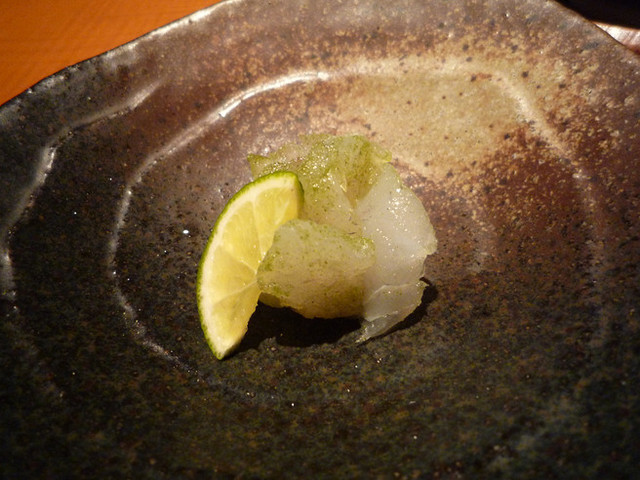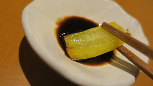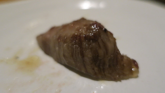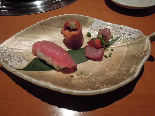 あもん(21)炙り三種(ザブトンの握り・ミスジの雲丹巻き・もものポン酢ジュレ乗せ)