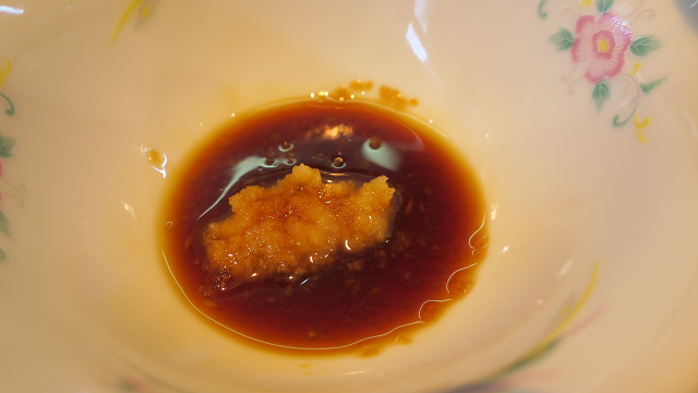 たまり醤油に辛味大根を落としたつけ汁はしっかりしたお味なのでほんの少し浸しただけで美味しく頂けますよ~