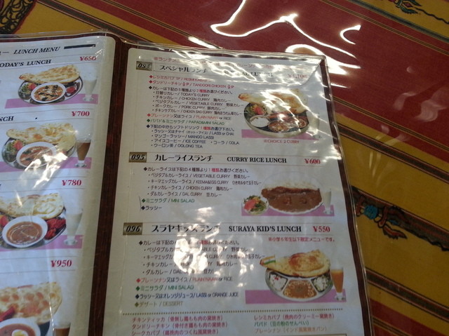 カレー(3種より1種)、ナン又はライス、ミニサラダ、パパド、ソフトドリンク。