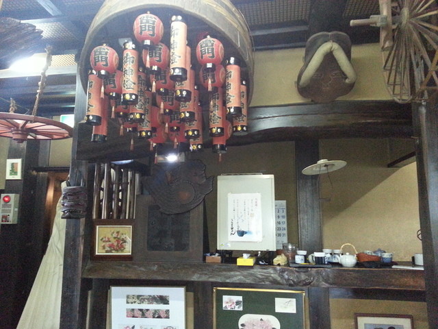 二階のお茶とかお絞りを準備するカウンター前には堤燈いろいろ・・・