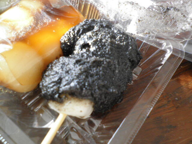団子は4本なのにずいぶん重いなあと思ったら、ごまに普通の倍くらいのごまあんが付いています。