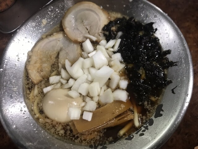 燕三条背脂ラーメン。トッピングはタマネギがオススメ