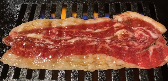 カルビ肉は1枚づつロースターで焼きます。焼けるとハサミで切って、タレ、溶き卵に付けて食べる趣向です。1枚目から順に切って食べ進めます。脂身もありますが実に美味しいお肉です。タレ+溶き卵がアクセントになってウマウマメニューです。これで1250円は信じられません。