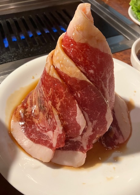 10分ほど待って、ご飯、わかめスープ、キムチ、ナムル、サンチュ、タレ、卵が登場です。続いてカルビ登場ですが、タワーになっています。大きな1枚肉を3枚うまく巻き付けて立ててあります。見た目のインパクトがすごいです。食欲をそそります。