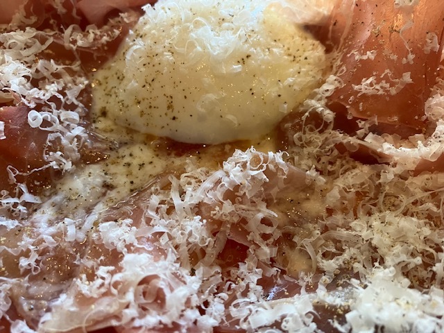 サラダはすぐに登場、生ハムが美味いです。ビスマルクは20分弱ほど待って登場です。釜から出たての熱々です。ピザの周囲の部分も固くはなく、柔らかくて食べ易いです。中心部は厚みはなく薄いものの、柔らかくフワフワの食感、生ハム、ドロドロに溶けたチーズ、半熟卵とよくマッチしてウマウマピザです。女性でも1人で1枚は大丈夫な量です。