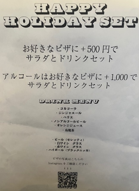 メニューよりビスマルクピザ2400円をランチセットでお願いします。ランチセット+500円はサラダとドリンクが付いて来るので、ウーロン茶をお願いしました。ちなみにアルコールのセットの場合は+1000円になります。