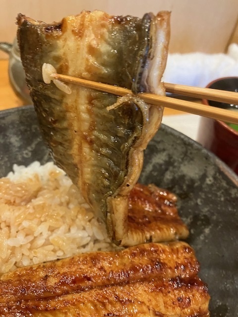 先客は4名。すでに食事が進んでいます。すぐに付け出しの鰻の骨せんべいが登場します。塩味が絶妙で美味。予約時にメニューを聞かれていたので5分後には、鰻丼中4700円が登場です。肝吸いも付いています。