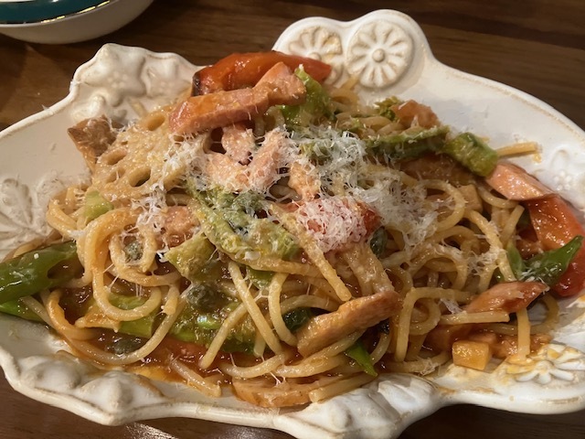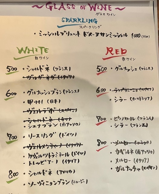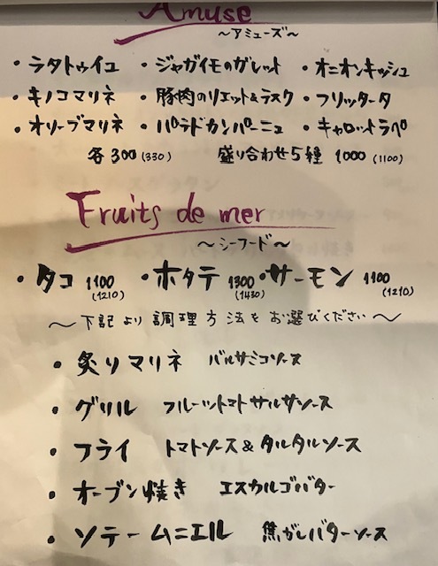 付け出しはミニハンバーグ500円、飲み物を注文後にメニューから前菜盛合せ5種1100円、ホタテのマリネ1430円、生春巻き1100円、カツレツ1430円、野菜とベーコンのパスタ1320円をお願いします。どれもお安い、期待感しかありません。