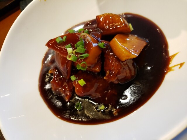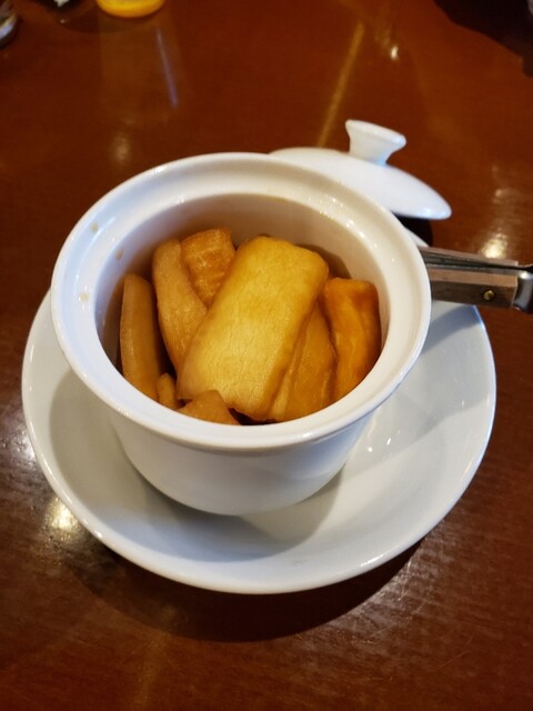小さなスペアリブみたいな豚肉、山芋、ジャガイモも美味しい、よだれ鶏は黒っぽい辣油の爽やかな辛さのタレに浸かっていて、やや小ぶりながら茄子の付け合わせも相性よく、それにピーナッツかな?、何かの豆がアクセントになってコレも悪くない。