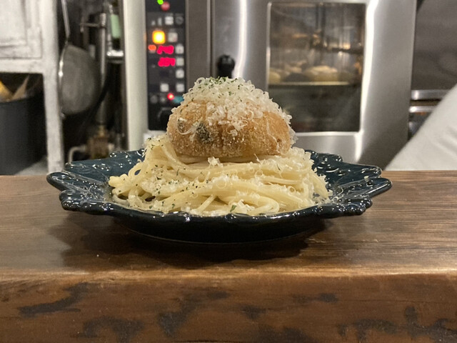 とても驚いたのがコロッケを崩して和えるパスタ。崩して和えてる時は???の状態でしたが、香りにそそられ食べてびっくり美味しい❤︎