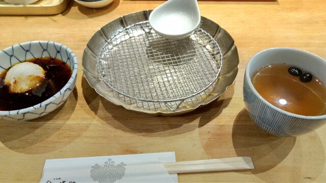 献立は松 芋の子餅をうずらつみれ、あげ田楽、本日の湊より、蟹飛竜頭、蕪いくら、帆立すし、きのこ青菜浸し、名物豆水とうふ又は翁とうふ、さわら柴焼、芋ご飯、味噌汁、香の物、おしるこでした。