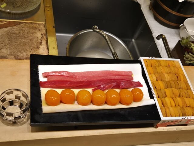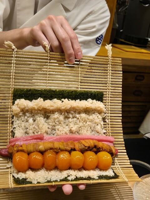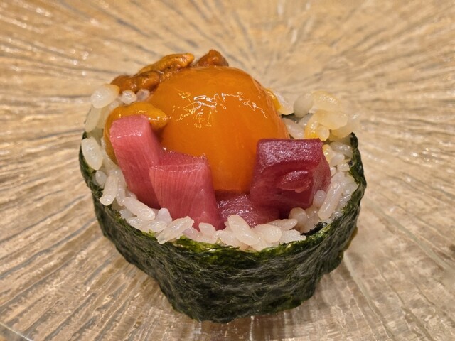 卵の黄身は漬けにされていて、マグロ・うに等が入っています