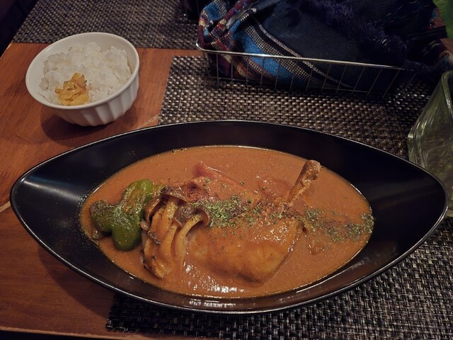粘度高めのカレーで小さめの骨付きチキンはホロホロにほどける位柔らかい