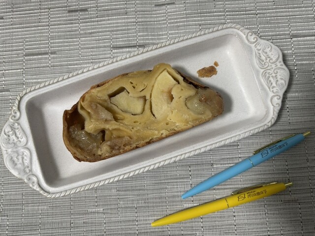 そして、シャンティークリームを添えると、りんごの酸味がまろやかになって、これまた美味しいです。生地は、パイ生地とかではなく、小麦のシートみたいな感じですよね。
