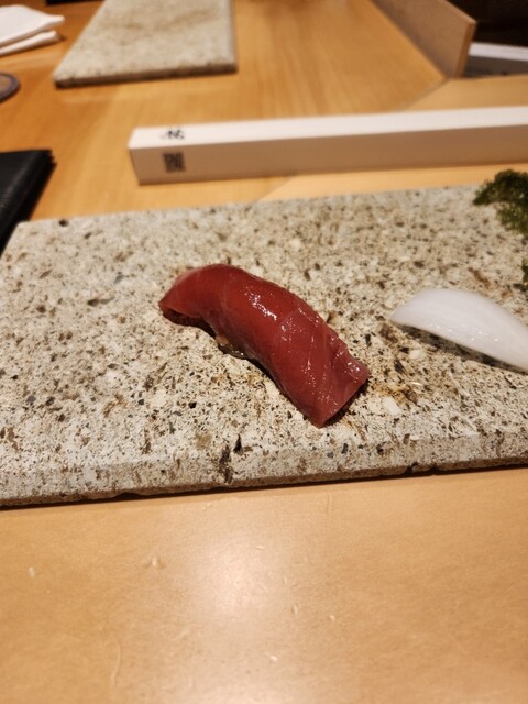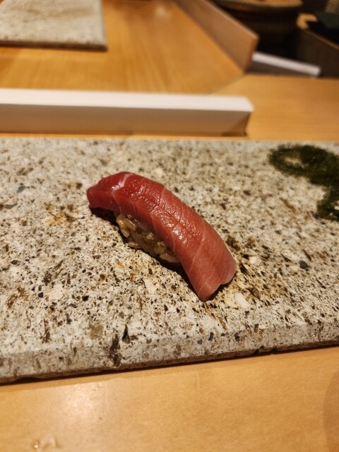 まずは有明産海苔のまぐろ手巻きから。お腹をすかせてきたお客さんが、ちょっと小腹を満たしてからコースを始めたいだろうなという大将の粋なはからい