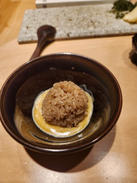 アワビを食べた後、肝に赤酢シャリを入れてもらう。濃厚な肝ソースとシャリの赤酢の酸味がよき!
