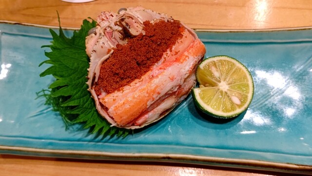 途中で目の前にあったセイコガニ甲羅詰めがあまりにも気になったのでオーダー、見た目以上に身が詰まっていてこれもまた美味なり。