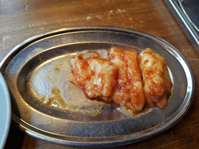 上ミノ、ホルモンはそのままで塩味が付いていて美味しい、幸先良し。