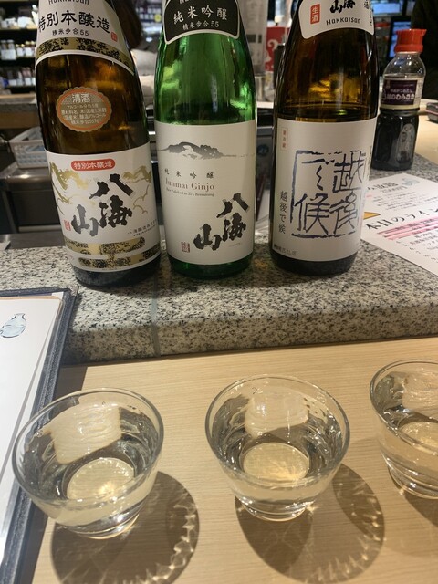 ベロベロになりそうなので飲み放題は諦め、普段メニューの八海山飲み比べと山葵漬けを注文。