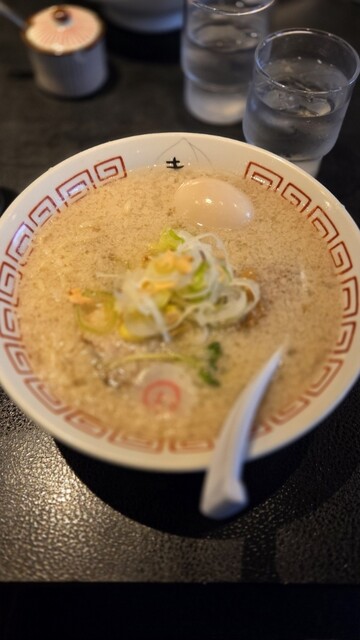 お店のXを見たと言ったら、玉子をサービスしてくれました。食券は先に預けるスタイルで、席に着くなりすぐサーブ。一見豚骨ベー...
