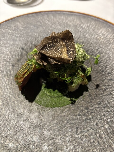 サマートリュフ、イカ墨のガレット、きのこのソースと