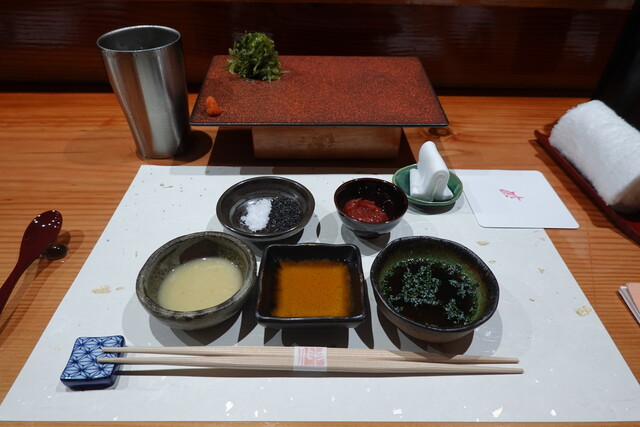 葉ワサビ、酢味噌、のむら特製出汁醤油、ポン酢、梅肉、塩、黒胡麻、ワカメ、 和らぎ水は霧島の水