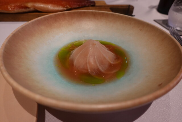 火入れして周りを削ぎ落とした柔らかい部分のスライス、3週間発酵させた蕪のスライス、1、2ヶ月発酵させた2種類のトマトの酢、ざくろ、生のいちじくの葉で作ったオイルを合わせたソース 、1ヶ月寝かした生のサーモンと3年目の奈良漬、燻製したサーモンの表面、発酵させた金柑の皮、すぶりの塩漬け