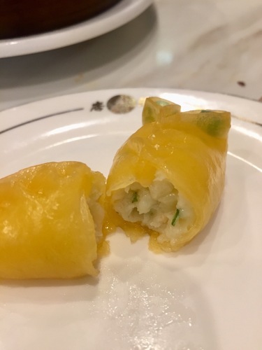 クワイ、筍の餡を卵入りの黄色い皮で包んだ餃子です。