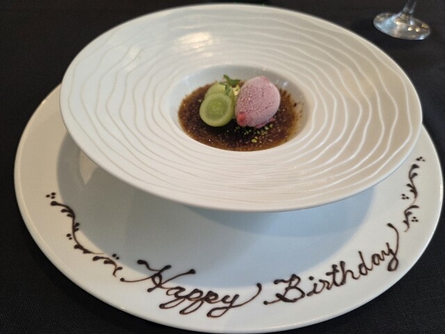 誕生日メッセージ入りの、ピスタチオのクレームブリュレ、カシスシャーベットとシャインマスカット