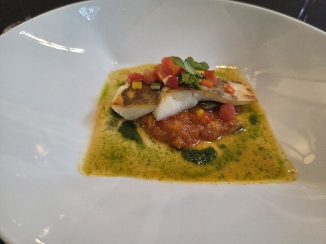 *魚料理(スズキのポアレ、ラタトゥイユとバジルのソース)