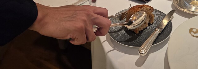 パンのサービスはフォーク&スプーンで掴むオールドスタイルです。