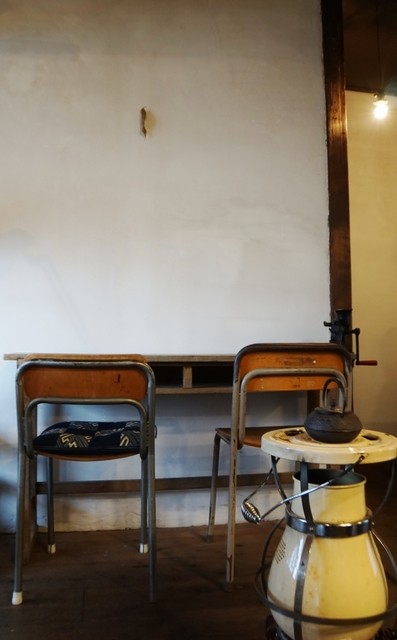 カウンターにイス2つ、奥に1テーブル、カベに向かってもうひとつ。