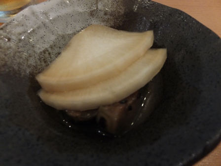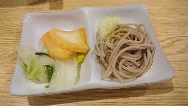 突き出しは,きゅうりの漬物とたくあん,蕎麦に紅葉おろしでした。
