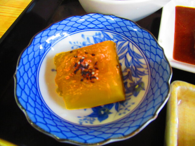 日替わりワンコインランチ・鯖味噌定食 500円(税込)のかぼちゃの煮物のアップ【2022年9月】