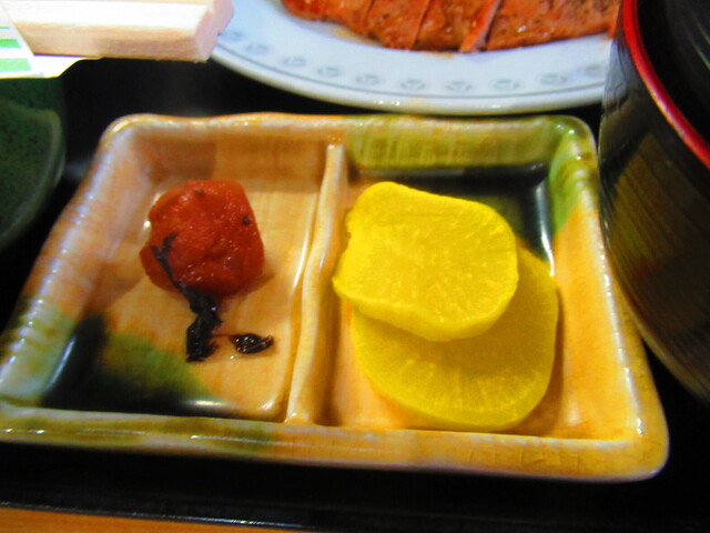 日替わりワンコインランチ・塩秋さけ定食 500円(税込)の漬物のアップ【2022年10月】
