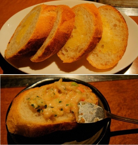 雅頌名物の食べ方は、ガーリックトースト(399円)にもんじゃ焼を乗せて食べます。