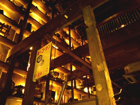 築80年の古民家を改築したお店で、壁一面2階まで達する棚がありお酒のボトルが並べてあります。昭和レトロな店内は照明が暗めでイルミネーションが点灯し、ショットバーのような落ち着いた雰囲気です。