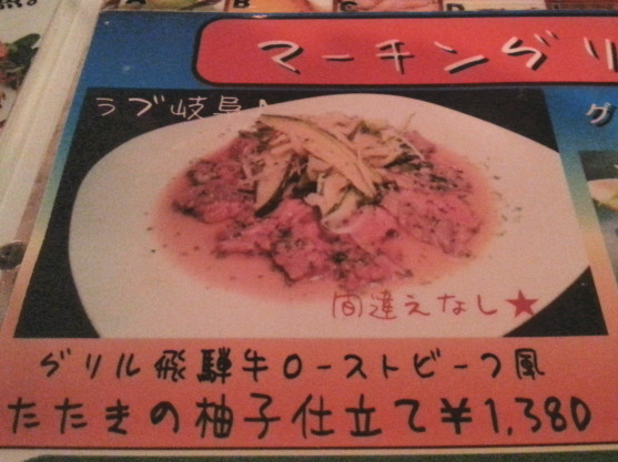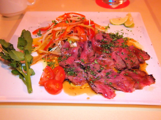 平成24年11月のお勧めメニューより『グリル飛騨牛ローストビーフ風たたきの柚子仕立て』(1380円)を注文しました。