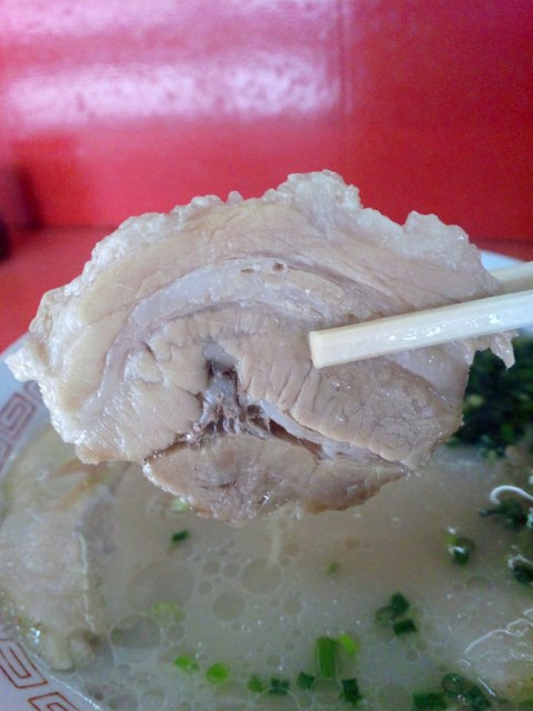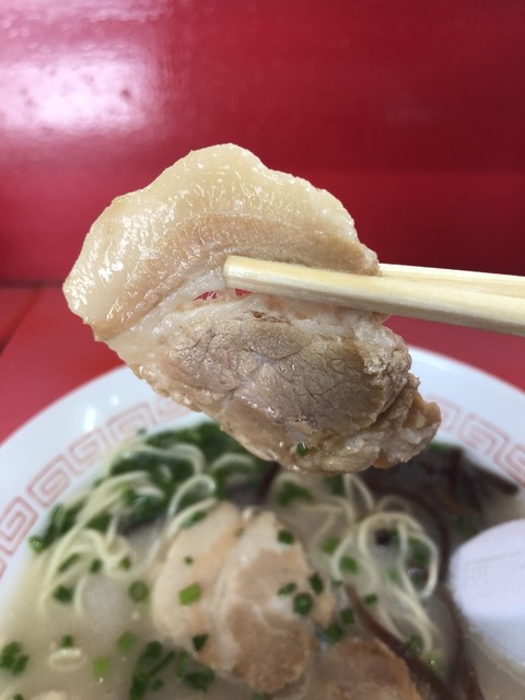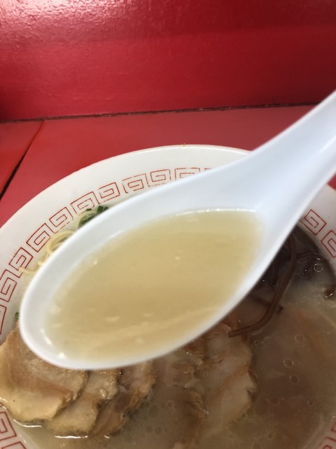 ラ―メン(450円) すっきりの豚骨スープ、そしてモチモチの中太麺、肉厚のチャーシューといい、素晴らしく美味しかったです