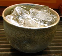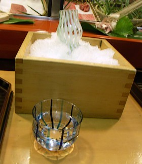 こりゃやっぱり「冷酒」が合うよね〜というわけで注文すると、かき氷が敷き詰められた大きな桝に、きれいなガラスの徳利を入れて出されました。