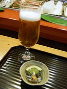 まずは生ビールで乾杯〜! お通しのナマコがこりこりして美味しいです。