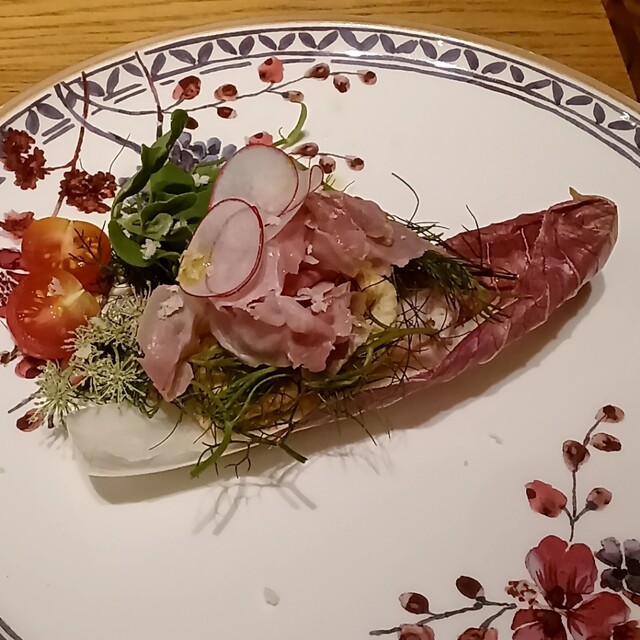 ◆ 自家製モルタデッラハムとプロシュットコットのフィオーレ仕立て 山わさび添え